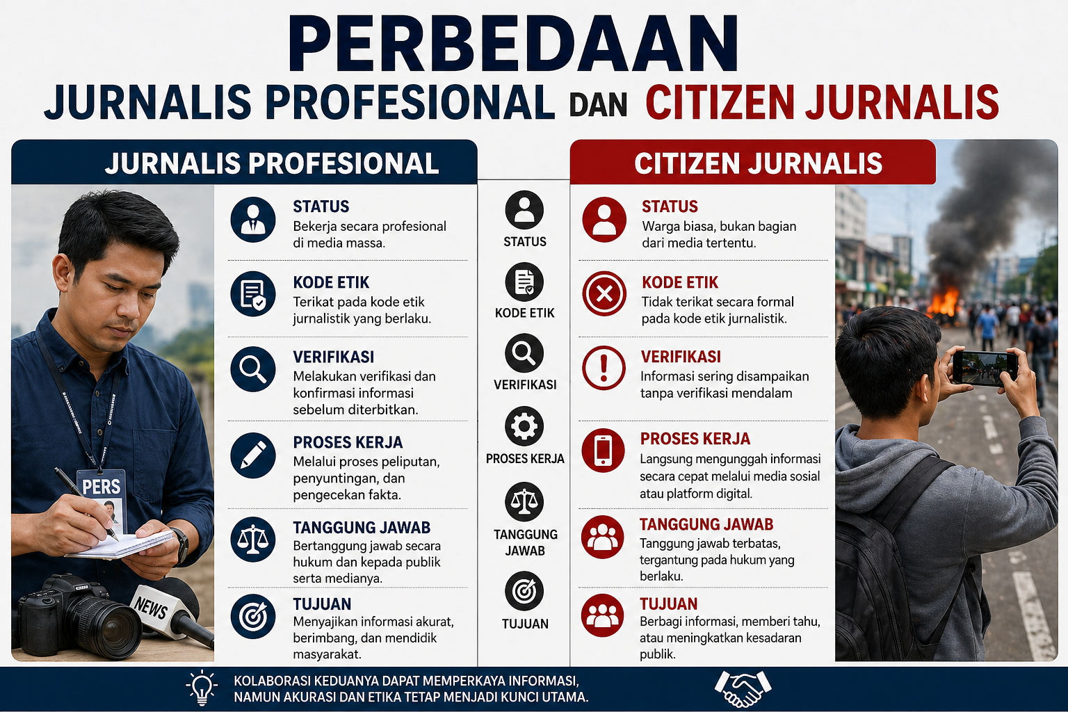 Perbedaan utama antara keduanya terletak pada aspek verifikasi dan tanggung jawab. Jurnalis profesional wajib melakukan konfirmasi terhadap berbagai sumber sebelum mempublikasikan berita. Sebaliknya, citizen jurnalis sering kali menyampaikan informasi secara cepat tanpa proses verifikasi yang memadai, sehingga berpotensi menimbulkan misinformasi atau hoaks.